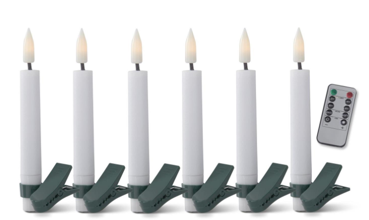 This set of 6 white LED tree clip candles features energy-efficient LED technology, a convenient timer function, and a remote control for easy operation. Perfect for enhancing seasonal decor, each candle securely clips onto tree branches for a classic look.