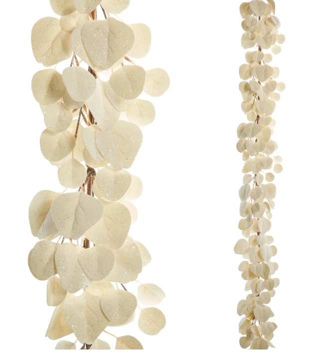 Enhance your decor with this 5' white eucalyptus garland, showcasing realistic foliage that adds a touch of natural elegance to any space. Its versatile design is suitable for mantels, tables, or event settings, offering enduring beauty throughout the season.