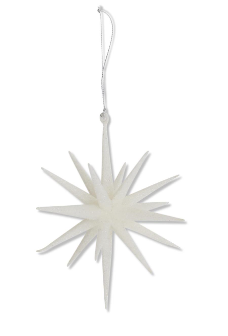 The 6-inch White Glitter Star Ornament features a sparkling design that adds a touch of elegance to any festive setting. Its versatile style makes it suitable for both traditional and contemporary holiday décor.