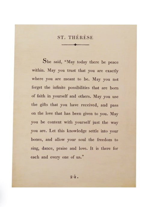 Quote: St. Therese- She said, "May today there be peace within. May you trust that you are exactly where you are meant to be. May you not forget the infinite possibilities that are born of faith in yourself and others. May you use the gifts that you have received, and pass on the love that has been given to you. May you be content with yourself just the way you are. Let this knowledge settle into your bones, and allow your soul the freedom to sing, dance, praise, and love. It is there for each and every one of us."