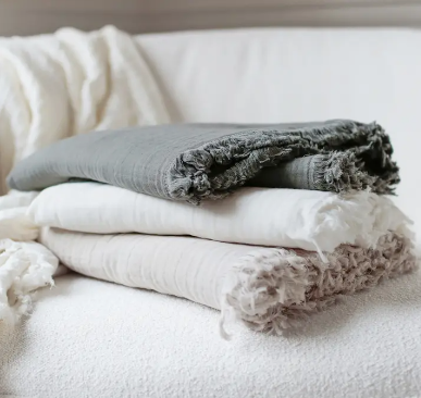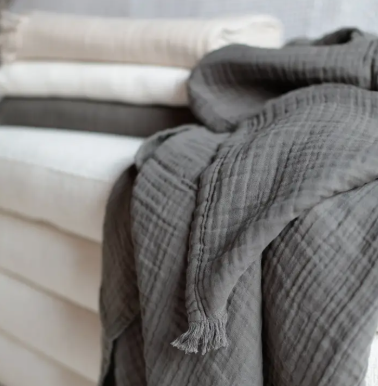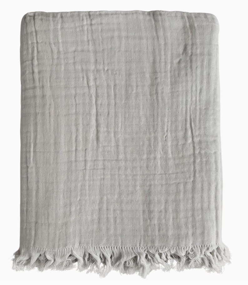 Wrap yourself in airy comfort with our lightweight gauze blanket, perfect for layering in every season. Crafted from soft, breathable cotton, its gently crinkled texture offers a relaxed look, while the fringed edges add a touch of rustic charm.