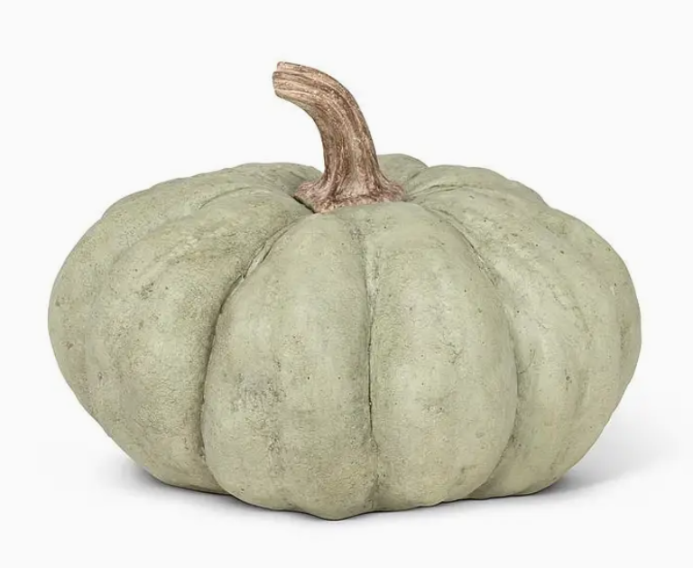 A festive accent for autumn decor. Crafted with intricate detail, in a soft green, this charming pumpkin stands at approximately 7 inches, showcasing a warm and inviting texture. The resin construction provides durability while adding a realistic touch. Perfect for tabletops or shelves, it brings a touch of seasonal charm to your home, celebrating the beauty of fall.