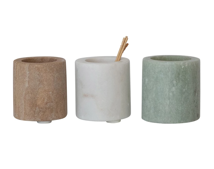 Crafted from a blend of durable sandstone and marble, this toothpick holder combines functionality with an elegant design. Its timeless style makes it a sophisticated addition to any dining or entertaining space.