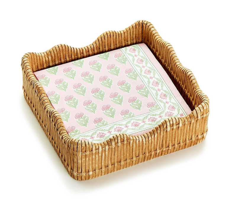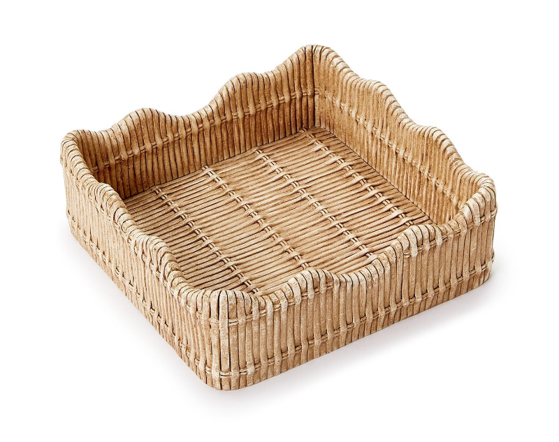 Crafted with precision, the basket weave pattern adds a touch of sophistication to any setting, making it a versatile accessory for both casual gatherings and formal events. The scalloped edges not only contribute to its elegant appearance but also serve a functional purpose, ensuring easy access to your cocktail napkins while preventing them from unruly dispersal.