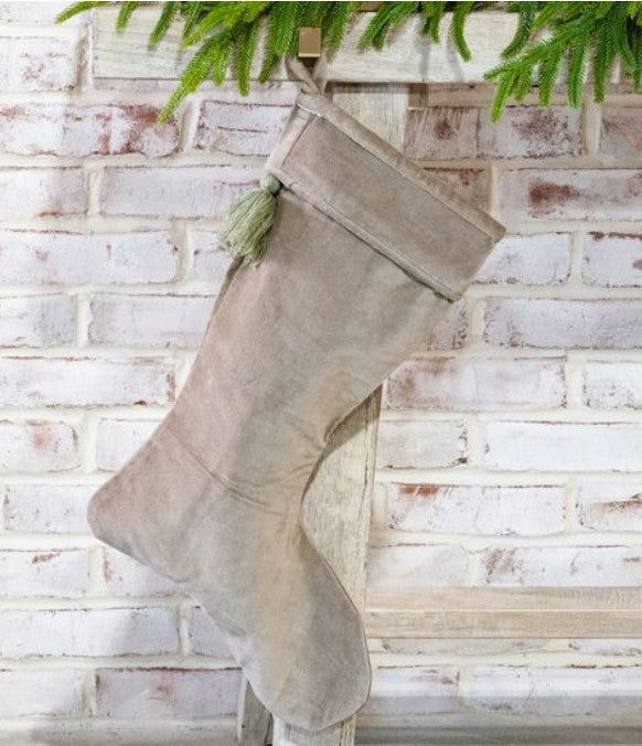 Crafted from luxurious velvet in a soft toffee hue, this stocking adds an elegant touch to your holiday décor. Its timeless design makes it a perfect addition to any festive setting.